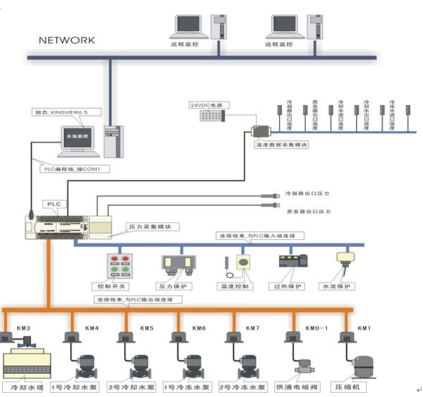 中央空調(diào)實(shí)訓(xùn)考核裝置(網(wǎng)絡(luò)型)要求系統(tǒng)采用 6 匹水冷機(jī)組,不銹鋼框架結(jié)構(gòu),終端建立一個(gè)專門房間進(jìn)行客戶的模擬,大廳的模擬直接利用教室原來空間,采用分水器和集水器對(duì)冷量或熱量進(jìn)行分配調(diào)節(jié),整個(gè)中央空調(diào)采用三菱 FX2n-48MR PLC 可編程控制器及工業(yè)總線控制,由計(jì)算機(jī)通過通信總線與 PLC 進(jìn)行通信,控制整個(gè)中央空調(diào)的運(yùn)行?照{(diào)的運(yùn)行參數(shù)由各類傳感器進(jìn)行采集,并通過通信總線送入計(jì)算機(jī)中,通過專用中央空調(diào)組態(tài)控制軟件進(jìn)行實(shí)時(shí)監(jiān)控。組態(tài)軟件要求能夠以動(dòng)畫的形式同步顯示系統(tǒng)的設(shè)備結(jié)構(gòu)、控制原理和流程。