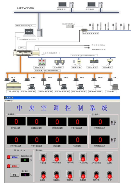 整個中央空調(diào)采用 PLC 可編程控制器及工業(yè)總線控制,由計算機(jī)通過通信總線與 PLC 進(jìn)行通信,控制整個中央空調(diào)的運行?照{(diào)的運行參數(shù)由各類傳感器進(jìn)行采集,并通過通信總線送入計算機(jī)中,通過專用中央空調(diào)組態(tài)控制軟件進(jìn)行實時監(jiān)控。在現(xiàn)場控制柜上可顯示中央空調(diào)的所有運行數(shù)據(jù),可進(jìn)行全手動和自動運行操作。