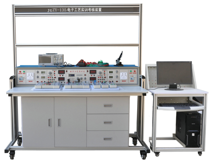 JGZY-135 型電子工藝實(shí)訓(xùn)裝置大體構(gòu)成上分:鋁合金活動(dòng)框架、實(shí)訓(xùn)電源臺(tái)、實(shí)驗(yàn)元件盒、個(gè)人PC(選配)