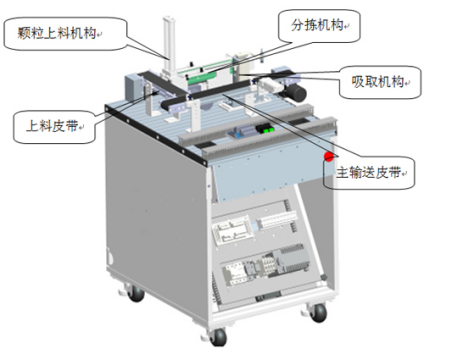主皮帶運(yùn)行,接收上一站擰好蓋后的物料瓶子,當(dāng)物料瓶經(jīng)過(guò)檢測(cè)機(jī)構(gòu)時(shí):回歸反射傳感器檢測(cè)瓶蓋是否擰緊;檢測(cè)機(jī)構(gòu)檢測(cè)瓶子內(nèi)部顆粒是否符合要求;對(duì)擰蓋與顆粒均合格的瓶子進(jìn)行瓶蓋顏色判別區(qū)分;擰蓋或顆粒不合格的瓶子被分揀機(jī)構(gòu)推送到廢品皮帶上(短皮帶);擰蓋與顆粒均合格的瓶子被輸送到皮帶末端,等待機(jī)器人搬運(yùn)。