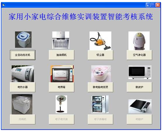 本家用電器實訓裝置包括電話煲、全自動洗衣機、電風扇、電烤箱、電飯煲、微波爐等故障分析與判斷方法。能使學生更全面的了解和掌握家用電器的工作原理和維修技能。