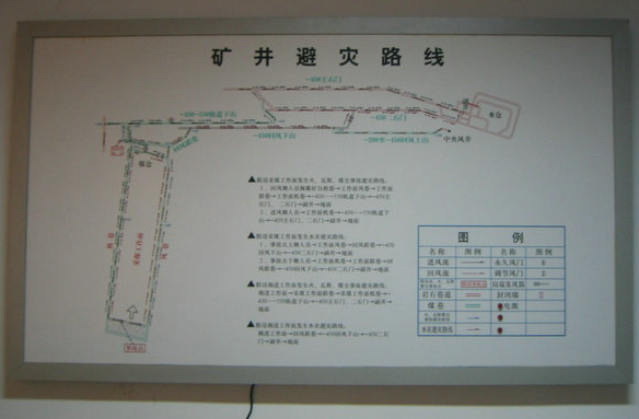 該礦井避災路線演示板模型顯示出了礦井發(fā)生災變時的避災路線。采用彩色發(fā)光管顯示。學員通過學習可進一步提高對各類型災害的避災路線的了解,并掌握避災基本知識,提高職工個體防護能力。