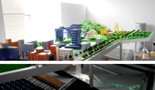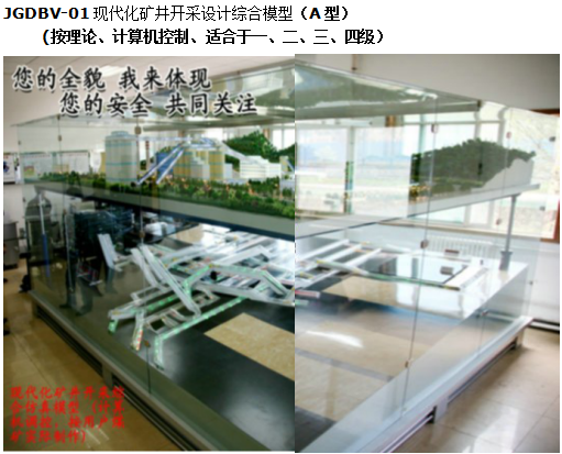 礦井開采設(shè)計綜合模型使用井上、下對照方式,能夠全面、系統(tǒng)模擬我國典型現(xiàn)代化煤礦的井上地面生產(chǎn)建筑布局和通風(fēng)、壓氣、排水、提升、運輸、轉(zhuǎn)載、供電、調(diào)度等機(jī)電設(shè)備的生產(chǎn)運行系統(tǒng)。具有完整的地面工業(yè)廣場和井下生產(chǎn)系統(tǒng)的開拓系統(tǒng)及齊全的采煤法(走向長壁和傾斜采煤法),左翼布置綜采采區(qū),右翼布置高檔普采工作面,多種通風(fēng)形式。電動燈光演示其生產(chǎn)工藝過程,能反映全礦通風(fēng)系統(tǒng),體現(xiàn)掘進(jìn)通風(fēng)與安全設(shè)施(三專兩閉鎖),顯示瓦斯監(jiān)測系統(tǒng)、CH4濃度超過1.0時開始報警,超過1.5時開始斷電,并模擬演示礦井災(zāi)變(如火災(zāi)或瓦斯爆炸)發(fā)生時,整個通風(fēng)系統(tǒng)發(fā)生連鎖反應(yīng)。多媒體可視化系統(tǒng)?娠@示主要工作點、轉(zhuǎn)載點的工作狀況,模擬生產(chǎn)指揮中心監(jiān)測監(jiān)控。展現(xiàn)了我國常用的各種采煤方法。并采用多種剖切手法,展現(xiàn)出各巷道之間的空間立體關(guān)系。在計算機(jī)與PLC相結(jié)合的控制手段下,能夠適應(yīng)不同專業(yè)的講課需要。為了滿足視覺效果更方便于教學(xué)同,地面工業(yè)廣場采用可升降系統(tǒng)。