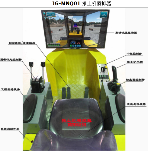 該設(shè)備硬件由設(shè)備底座、駕駛座艙、設(shè)備座椅、PC系統(tǒng)、視景顯示器、轉(zhuǎn)向控制桿、IC卡讀寫(xiě)器、360度視角搖桿、制動(dòng)踏板、減速踏板、松土器控制桿、數(shù)據(jù)采集系統(tǒng)及各種功能按鈕等組成。設(shè)備采用與真實(shí)推土機(jī)相同的操作部件,逼真的操作手感,使得其操作功能、操作感覺(jué)與真機(jī)完全吻合;