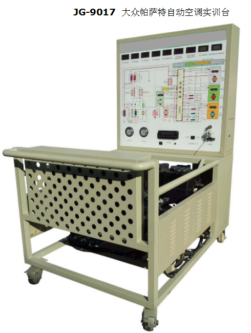 汽車(chē)空調(diào)系統(tǒng)實(shí)驗(yàn)臺(tái) 手動(dòng)空調(diào)電控系統(tǒng)的故障設(shè)置、故障診斷、檢測(cè)、排除和實(shí)際測(cè)量等實(shí)踐性教學(xué)以及考核使用,智能故障設(shè)置控制功能,可連接電腦設(shè)置故障,并可連機(jī)設(shè)置。體現(xiàn)國(guó)產(chǎn)新型,有代表性。要求配置全新的空調(diào)裝置。帶熱水裝置,既能制冷也能制熱。為滿(mǎn)足冬季教學(xué)需要,帶低溫強(qiáng)制制冷起動(dòng)開(kāi)關(guān)。使用134a無(wú)氟環(huán)保冷媒,能設(shè)置電控系統(tǒng)故障。測(cè)試面板帶完整電路圖與雙向測(cè)試端口,不用拔拉電器插頭或穿刺導(dǎo)線(xiàn),能開(kāi)展包括電阻、電壓、頻率、脈寬、占空比、示波和導(dǎo)通性測(cè)試等全部應(yīng)用技術(shù)的實(shí)踐性教學(xué)與實(shí)作訓(xùn)練。 , JG-9017 大眾帕薩特自動(dòng)空調(diào)實(shí)訓(xùn)臺(tái)