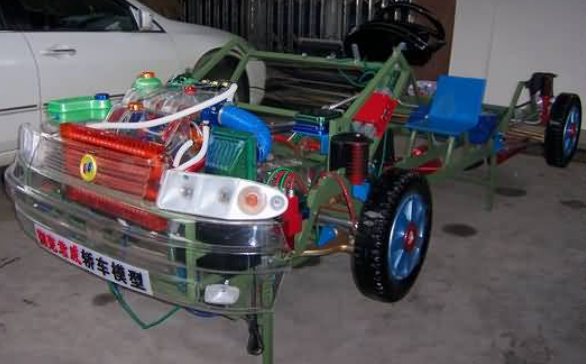 本品選用透明有機玻璃制作,內中部件均以硬質塑料加工,利用螺絲固定在金屬高溫烘漆而成的車架上。各總成都以壓模成形加工,代替過去用膠水粘合的辦法,使本品在牢固度上有很大的提高。發(fā)動機總成,以電力驅動,油門設有調速裝置,能演示發(fā)動機轉速的高低。離合器分離明顯,操縱靈活,離合器外殼整體壓模而成,變速器的各檔齒輪用各種顏色表示,操縱自如,其中主減速、差速,轉動靈活,車輪對開壓鑄,刻有防滑槽紋,看上去美觀大方。轉向裝置以及電瓶、油箱、水箱,做工精細,富有光澤。制動管路分布清楚,一目了然。電路采用對插件前后分布,前燈架和風扇用透明有機玻璃壓模成整體,看上去美觀逼真,儀表板及后燈架逼真堅固。