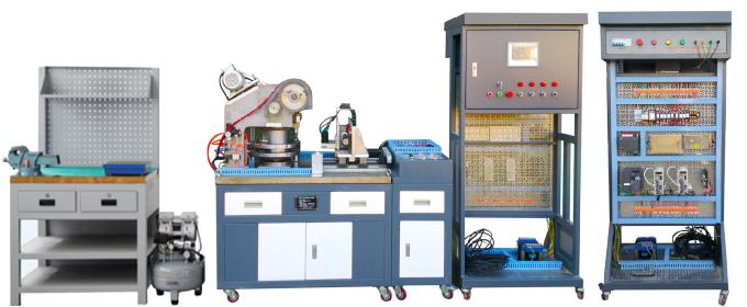 本實(shí)訓(xùn)裝置主要由實(shí)訓(xùn)臺(tái)、電氣控制柜(包括電源控制模塊、可編程控制器模塊、變頻器模塊、觸摸屏模塊、步進(jìn)電機(jī)驅(qū)動(dòng)模塊、伺服電機(jī)驅(qū)動(dòng)模塊等)、動(dòng)力源(包括三相交流電機(jī)、步進(jìn)電機(jī)、交流伺服電機(jī)等)、機(jī)械傳動(dòng)機(jī)構(gòu)、二維送料部件(十字滑臺(tái))、轉(zhuǎn)塔部件、模具、 離合器機(jī)構(gòu)、 機(jī)械式?jīng)_料機(jī)構(gòu)、裝調(diào)工具、常用量具、操作臺(tái)、型材電腦桌等組成。