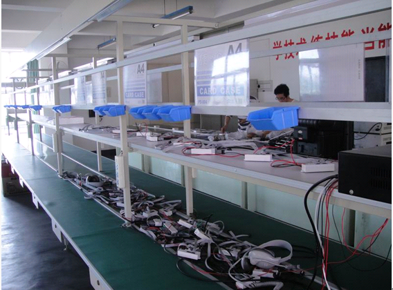 結(jié)構(gòu)形式采用: 平型皮帶機(jī),輸送帶上還可增設(shè)提升擋板、裙邊等附件,能滿(mǎn)足各種工藝要求。輸送機(jī)兩側(cè)配以工作臺(tái)、加裝燈架,可作為電子儀表裝配線(xiàn)。