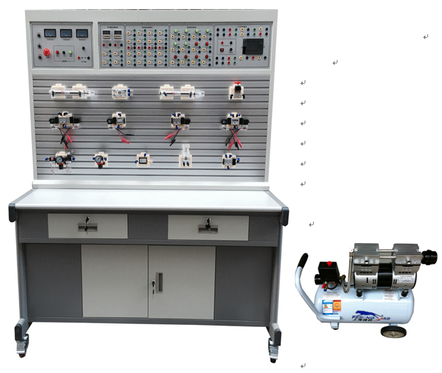 模塊、控制按鈕模塊、時間繼電器模塊、液壓泵站、液壓元件、氣泵、氣動元件等組成。