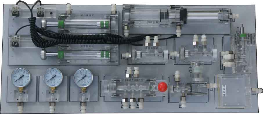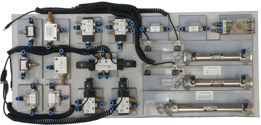 氣動面主要包括:梯形雙立面實驗臺、鐵質(zhì)實驗桌、氣動元件(20多種)、電器控制模塊(5只)、空氣壓縮機、元件固定配置板、工具及附件等。