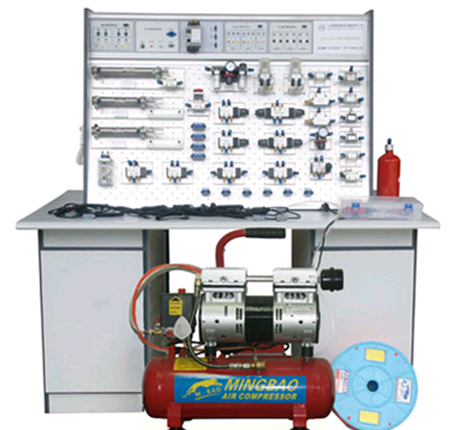氣動-PLC控制實驗臺主要由實驗桌及實驗支架、氣動元器件、電氣控制器件等組成,實驗桌及實驗支架采用“二合一”設(shè)計結(jié)構(gòu),即一套實驗設(shè)備可供兩組學(xué)生同時進行實驗,優(yōu)化共享資源,提高產(chǎn)品的性價比。氣動元器件配備:空氣壓縮機,空氣過濾、減壓、油霧器三聯(lián)件,減壓閥,手動換向閥,電磁換向閥,氣控換向閥,行程閥,單向閥,節(jié)流閥、單向節(jié)流閥、快速排氣閥,或門型梭閥,單作用氣缸,雙作用氣缸、旋轉(zhuǎn)氣缸等。電氣控制器件:直流24V(3A)電源單元,PLC可編程序控制器(日本松下FP1--C14),PLC電氣控制輸入單元, PLC電氣控制輸出單元,繼電器控制單元,行程開關(guān)(常閉、常開)。